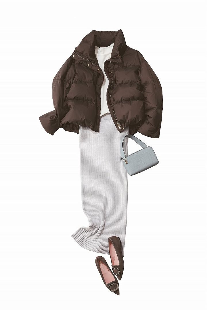 シックなブラウンダウンは、淡いトーンのボトムと合わせて重さを回避。縦ラインを強調するニットスカートで、冬でもすっきりとした印象に。ブラウン×ライトグレーの上品配色が、洗練ムードを引き立てます。