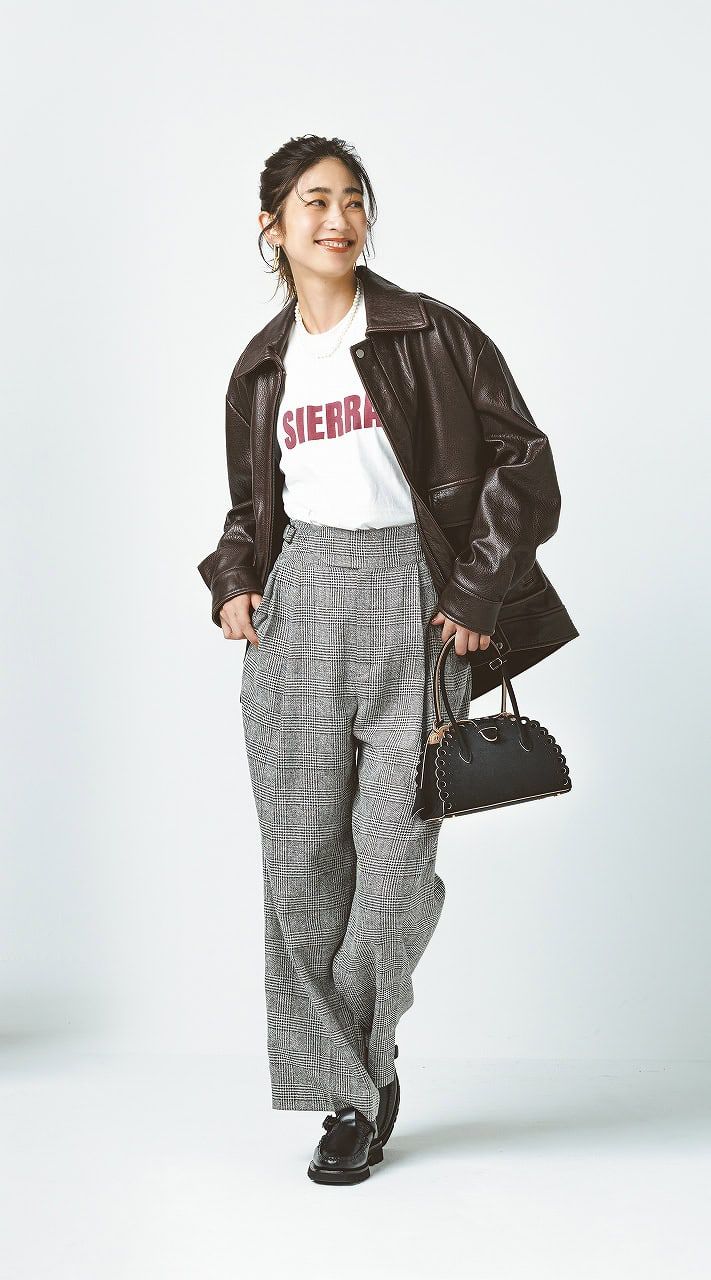 光沢を抑えたブラウンレザーが、クラシックなチェックパンツにモードな表情をプラス。赤のロゴTで遊びを効かせつつ、全体は落ち着いたトーンでまとめてこなれた印象に。