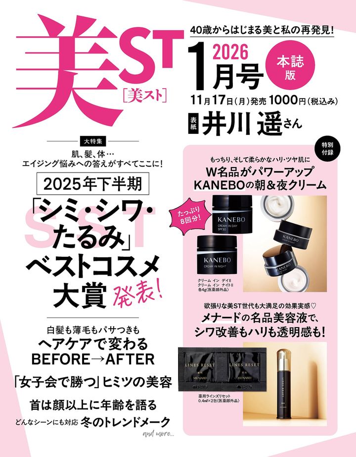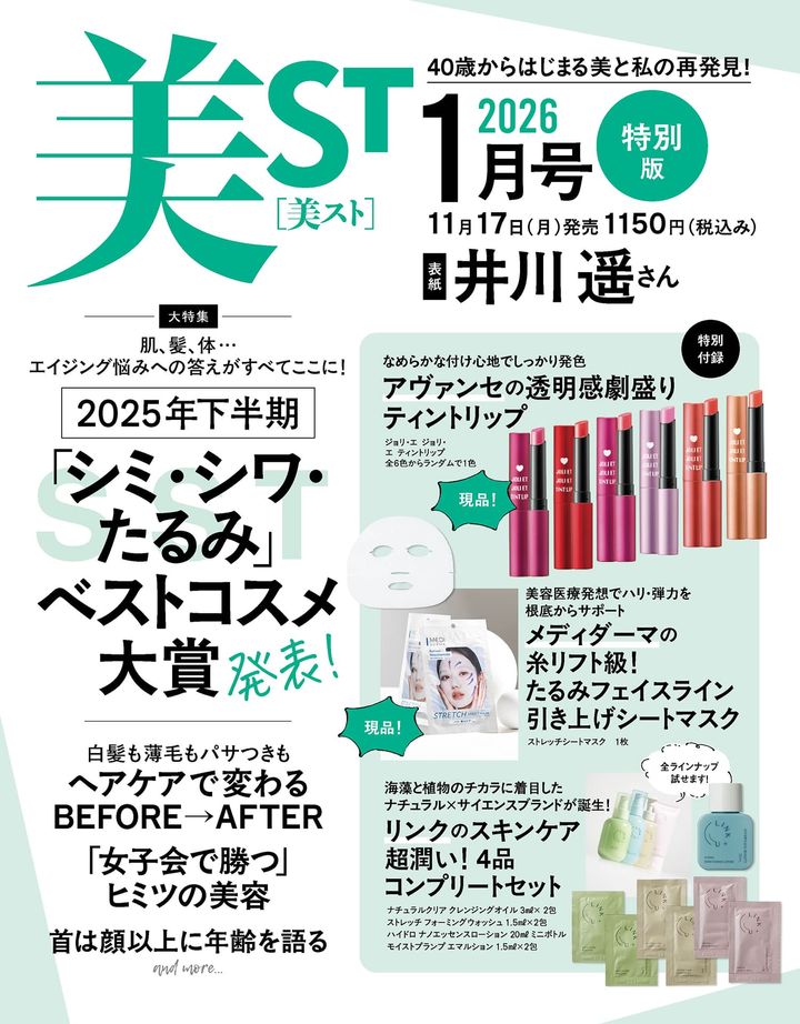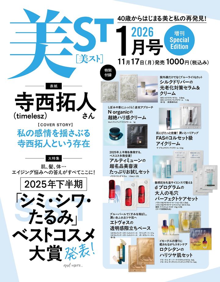 11月17日(月)発売・美ST2026年1月号のネット書店予約がスタートしました!本誌・特別版は井川 遥さん、増刊Special Editionは寺西拓人さん(timelesz)が美ST初表紙を飾ります。本誌付録はメナードの名品美容液とKANEBOの朝&夜クリームをたっぷりミニジャーで。特別版にはリンクの潤いスキンケア4品セット、メディダーマのたるみ引き上げシートマスクとアヴァンセのティントリップはなんと現品が付録に!増刊Special Editionには、d プログラムの大人の毛穴パーフェクトケアセット・エトヴォスのトリートメントベース・FASのアイクリーム・N organicのハリ感クリーム・ロクシタンのハリツヤ肌セット・シルクドリバーの光老化対策セラム&クリーム・アルティミューンの超名品美容液が付録につきます!豪華付録につき、完売必至です。ネット書店が完売の際はお近くの書店でのご予約がおすすめです。