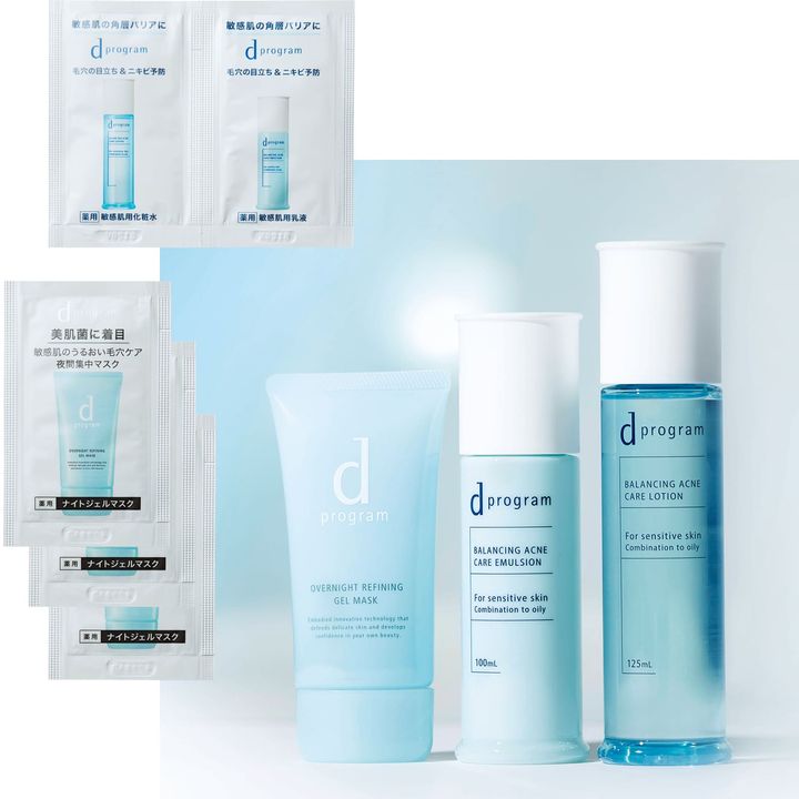 先進サイエンスに基づいて整えるケアをラインで試せます。バランス&アクネケア ローション EX 1.5ml×パウチ1包、バランス&アクネケア エマルジョン EX 0.7ml×パウチ1包、薬用 ナイトジェルマスク 1.5g×パウチ3包