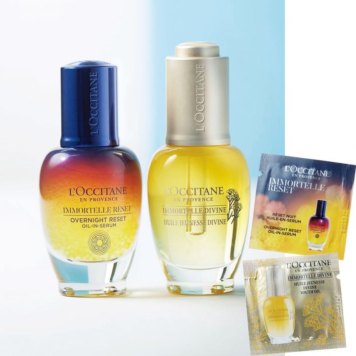 イモーテルの香りに癒されながら、スキンケア。イモーテル オーバーナイトリセットセラム 1ml、イモーテルディヴァインインテンシヴオイル 1ml パウチ各1包