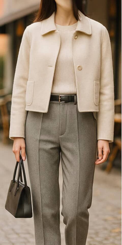 さらに冷え込む日は、ショート丈のノーカラーコートやテーラードジャケットを羽織るのが◎。全体の重心が上がり、今っぽい軽やかさが生まれます。