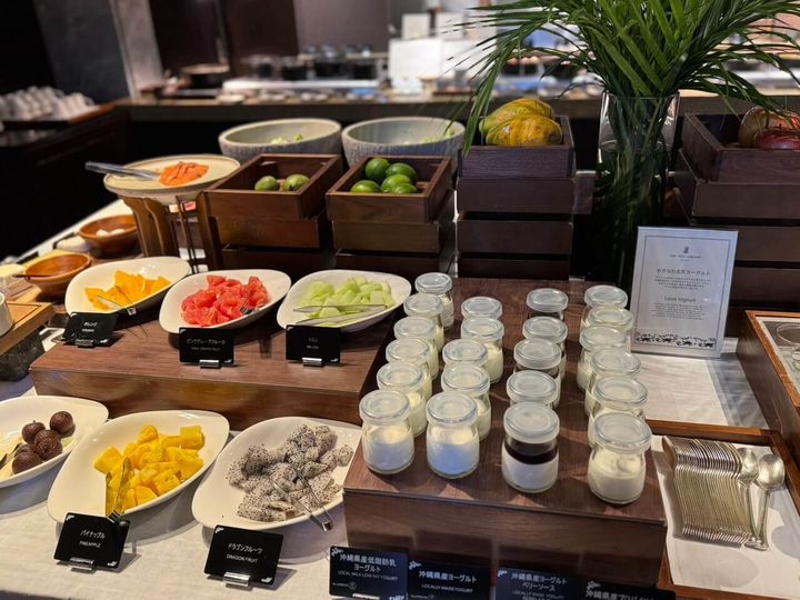 連泊するなら、1日目は和食、2日目は洋食…と日替わりで楽しむのもおすすめ。沖縄の伝統的な揚げ物で、魚のすり身を衣に使った「もずくのちきあげ」や、スパイシーなタコス風味のお肉をぎっしり詰め、サクッと揚げた「たこすボール」、沖縄県内の酪農家がザ・リッツ・カールトン沖縄のために仕立てたプレミアムヨーグルトなど、地元ならではの食材が並びます。