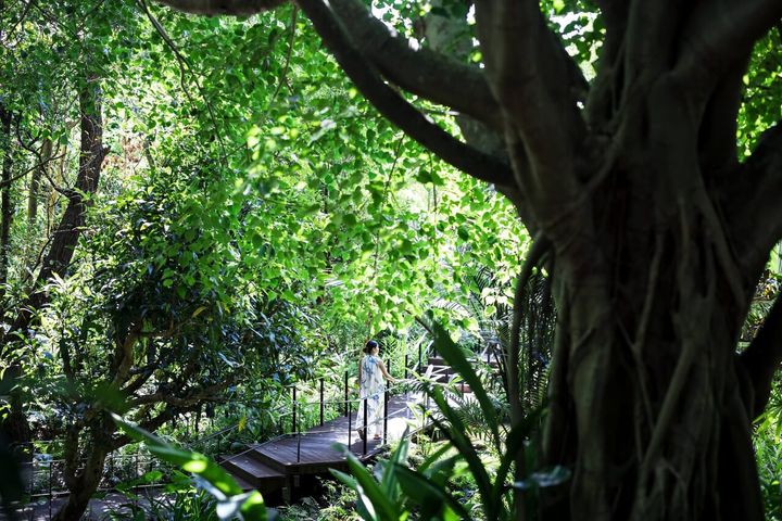 朝食の余韻を楽しんだら、日頃の疲れを癒すスパ体験へ。ザ・リッツ・カールトン沖縄では、客室やレストランがある本棟と、屋内プールやジム、温浴施設が集約されたスパ棟の2棟にわかれています。竹のトンネルを抜けると、目の前に広がるのは森林。風の音、虫の声、そして木々の香りを感じながら、これから始まるスパ体験に胸を弾ませます。