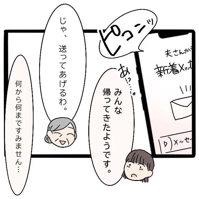 そうこうしていると、夫からメッセージが返ってきました。みんなが帰ってきたことを伝えると、女将さんが家まで送ってくれました。2人の優しさに触れて、義実家でひどい扱いを受けて傷ついた心が、少しだけ回復したような気がします。