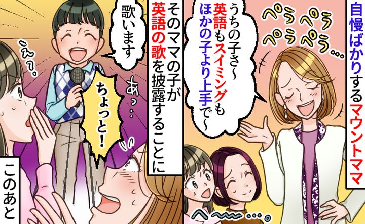 近所の公園でよく顔を合わせる“マウントママ”がいます。「うちの子は英語もスイミングも完璧!英語なんて、みんなまだでしょ〜?スイミングもほかの子よりずっと進んでるのよ〜」と、いつも自慢ばかり。そんなある日――。
