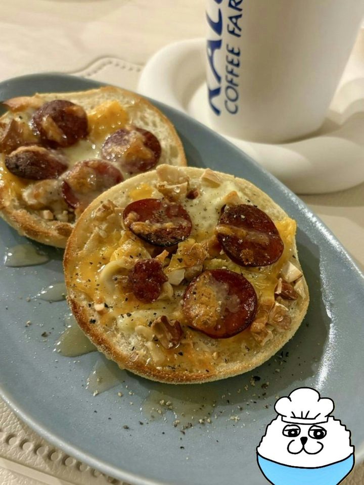 砕いたミックスナッツ、とろけるチーズ、チェダーチーズ、モッツァレラチーズ、サラミを乗せて焼いたら蜂蜜と黒胡椒かけて完成〜☆ X「麦ライス(シェフ)」(https://x.com/HG7654321/status/1959764380318597631,2025年9月10日最終閲覧)