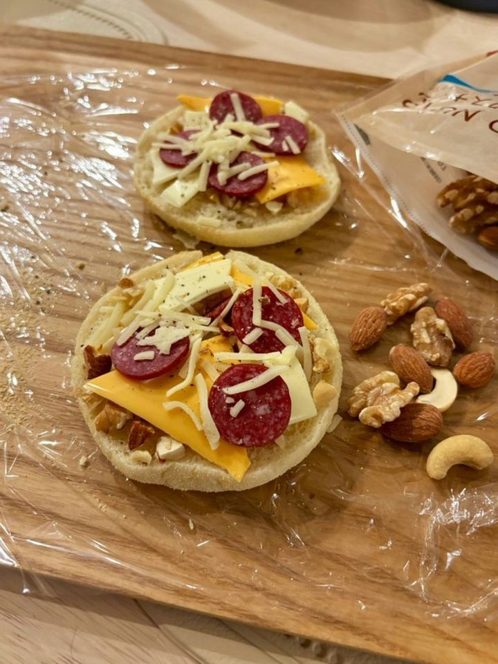 イングリッシュマフィンと聞くとジャムやクリームチーズ、とけるチーズやベーコンをサンドするなどさまざまな食べ方がありますよね。麦ライスさんのレシピでは、3種類のチーズに加えサラミ、はちみつ、黒胡椒にミックスナッツを使用するそう。材料を聞いただけで美味しい組み合わせなのがわかってしまいますよね。