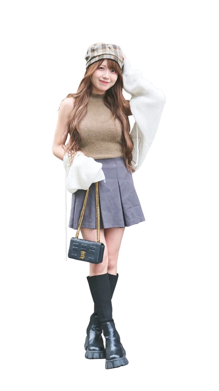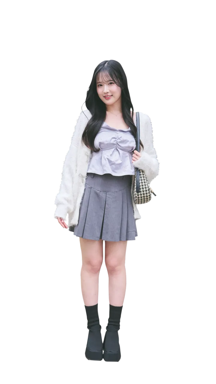 「プリーツスカートはユニクロ。カーディガンとトップスはSHEINで約2,000円と、コーデは超プチプラ。だけど、バッグにはお気に入りのBurberry。ハイブラがひとつあるとコーデが高見えする!