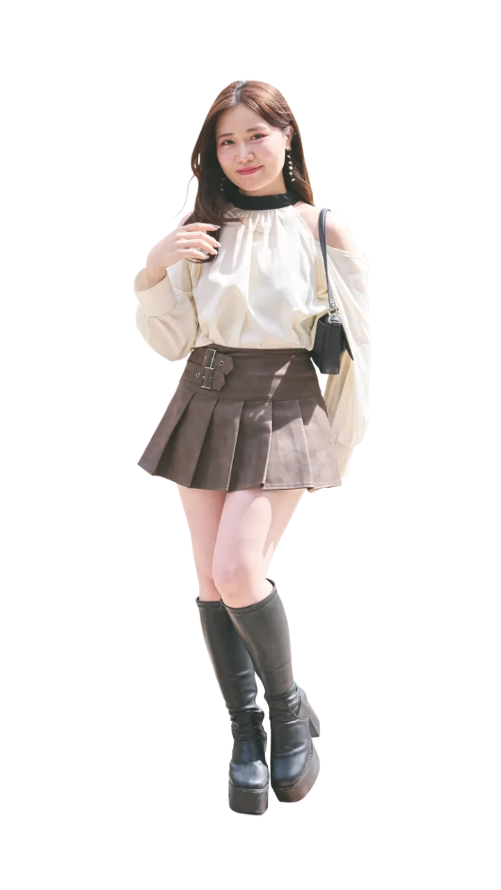 韓国で約1,500円で買ったレザーのプリーツスカートにDHOLICの肩見せトップス。そしてデートに必須のGRLの約3,000円の黒ブーツで、私的最強夜遊びコーデの完成!