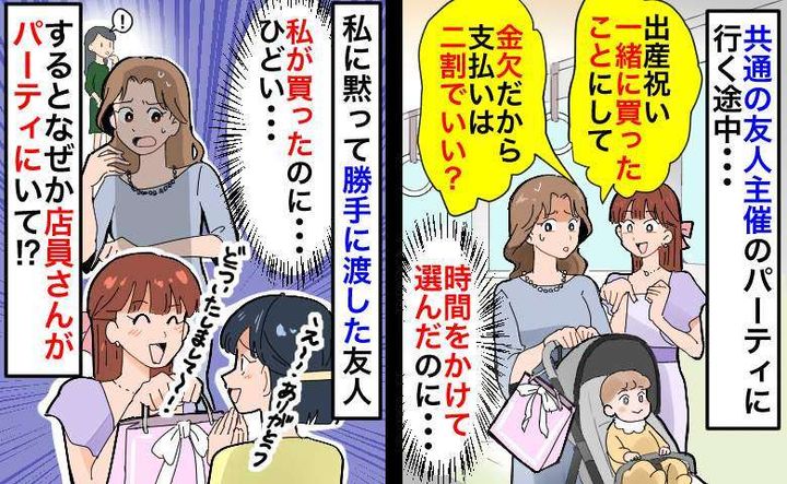 私が買った出産祝いを勝手に渡す友人「私が選んだの〜!」嘘つき…え!?なぜか店員さんがパーティーに
