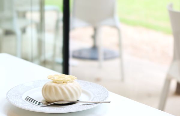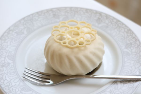 キャラメルケーキを白い洋梨のムースで包んだ上品な味。本館1階の香水塔に見立てたケーキです。白い洋梨のムースはふわっとしたくちどけでした。上に乗せられたクッキーの香ばしさと下に添えられた竹炭のソースがほどよいアクセントに。