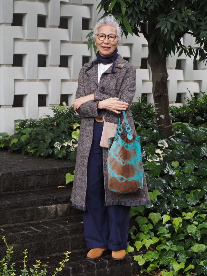 「カジュアルエレガントをモットーにコーディネートを組んでいます」と語るマサミさん。この日は、「マーガレットハウエル」のシャツとヴィンテージ風のワイドパンツでマニッシュにまとめつつ、仕立てのいいロングコートをオン。細やかな織り柄が上品で、クラシカルな雰囲気を醸し出しています。