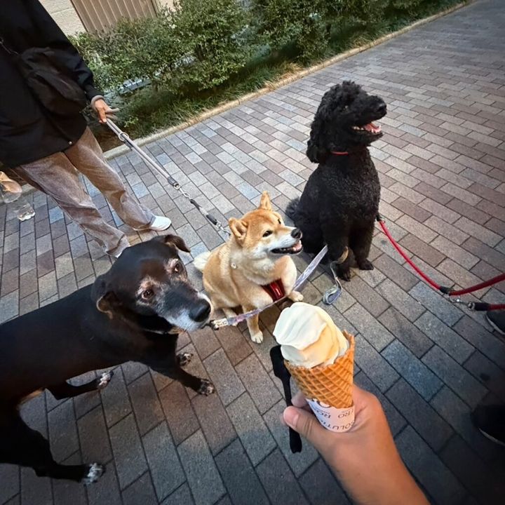 こんにちは、ハルくんです。夕方はめっきり寒く、冬っぽさが増してきた今日この頃。夕方散歩はドッグランにも公園にも寄らず、街中を流すことが増えました。そんななか、シニアビーグルのグッディのママが「〈ロストロ〉のコーヒーソフト、今季はもう終わっちゃうよ〜」というお知らせをくれました。こりゃ大変だってことで、夕方散歩にかーちゃんと行ってきたら、台湾犬のグーフィーとご近所のスタンダードプードルのユイットに遭遇! うれしい偶然があるものです。3にんで並んでソフトクリームと一緒に記念撮影して帰りました。そしてちょびっとだけソフトを舐めさせてもらいました。とってもおいしかったです。