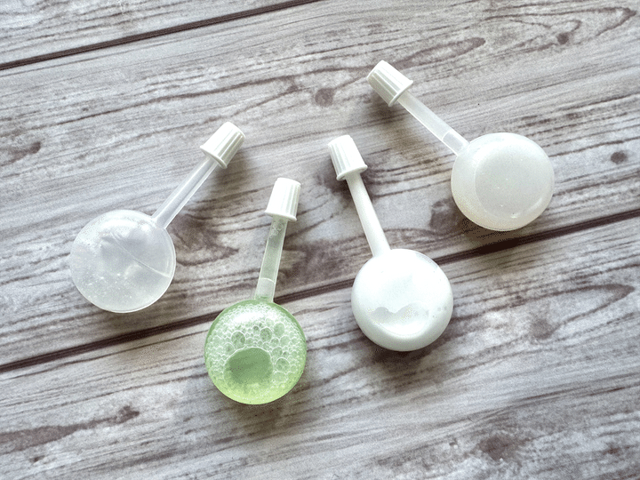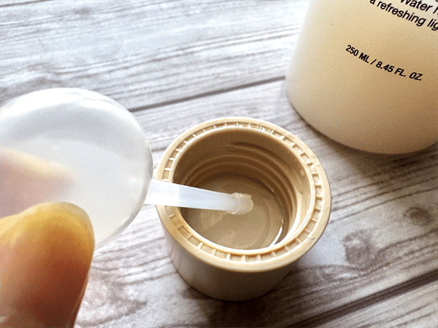 大きめの小分けボトルにジェルや乳液など粘性があるものを入れると、容器を逆さまにしないと中身が出てこないということがありますが、こちらはスポイト部分を押すとスムーズに出てきます。これはポイントが高い!