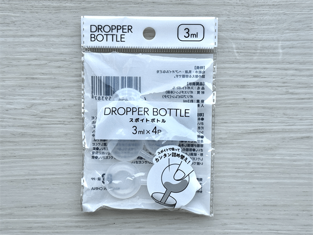 セリアの「スポイトボトル」は、3mlのミニボトル4個入りで、価格は税込110円。透明のボトルに白いキャップ付きです。スポイト部分は柔らかく、軽く押すだけで液が吸い上がります。