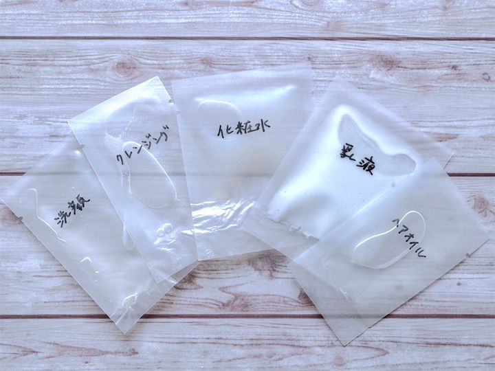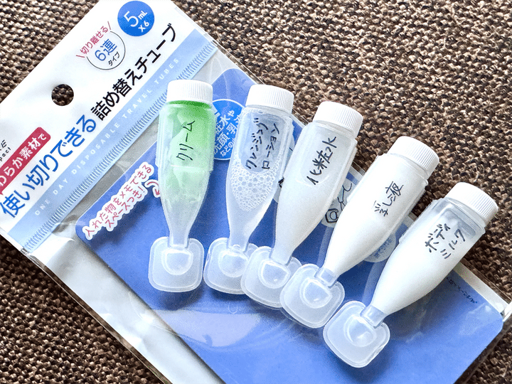 化粧水、乳液、美容液、洗顔ジェルを詰め替えました。何が入っているかすぐ判別できるように「化粧水」「乳液」など、油性ペンで記入しておくのもいいですね。今回は何が入っているか一目瞭然だったので、記入しませんでした。
