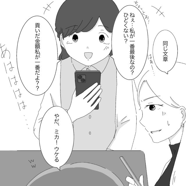 「同じ文章・・・」とため息まじりに呆れるカナコ。私はその横で「ねぇ、私が一番最後なの?貢いだ金額私が一番だよ?」と笑いながら言いました。レンがきっかけで仲良くなった私たちにとって、このタイミングで彼から連絡が届くのは、笑いのネタにしかなりませんでした。