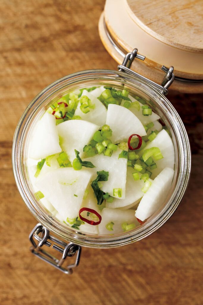 冬においしさが増す大根を、さっぱり甘酢漬けに。砂糖のやさしい甘みで大根のくせがやわらぎ、葉もまるごと味わえるひと品です。
