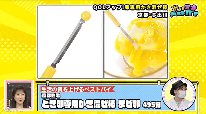 「ル・プチメック」の女子大生アルバイトのベストバイは、料理の見た目と舌触りがワンランクアップする、とき卵専用かき混ぜ棒。お箸を使うよりも、「白身と黄身がすぐ混ざる」「オムライスをよく作るんですけどキレイになる」とのこと。彼女は、「卵料理が好きなので買ってよかった」というこのアイテムで、一人暮らしの自炊を頑張っているそうです!
