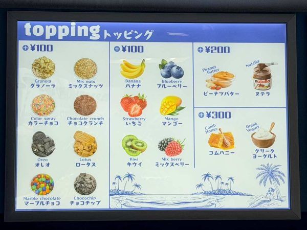 さらに、フルーツやグラノーラなどのトッピングも自由にカスタマイズ可能。自分だけのオリジナルアサイーボウルを作れるのも魅力です。