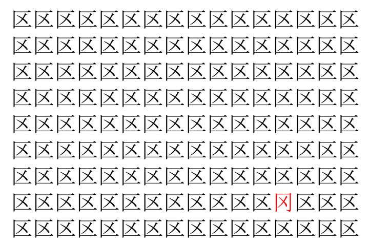 画像の中には、「区」という漢字が縦に9行、横に16個並んでいます。 全部で144個となりますが・・・、そのうち1つは「異なる漢字」となってますよ!!