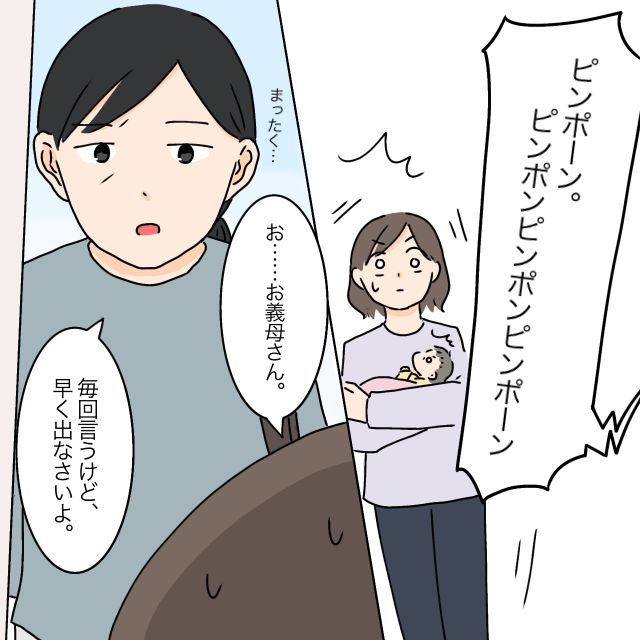 退院して数日が経った頃、自宅でココネを寝かしつけていると、突然インターホンが鳴りました。嫌な予感がしながらドアを開けると、そこにはしかめっ面をした義母が立っていました。義母は「毎回言うけど早く出なさいよ」と言うと、遠慮する様子なくズカズカと自宅に上がります。