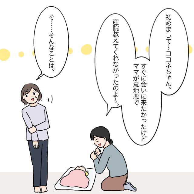 「初めまして~ココネちゃん、すぐに会いに来たかったけどママが意地悪で産院教えてくれなかったのよ~」私への嫌味を添えて、ココネに挨拶をする義母。私は目を逸らしながら「そ・・・そんなことは」と言いました。