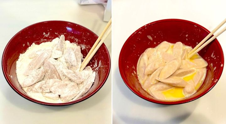 なお、こちらのレシピには「小麦」「卵」「ごま」を使用しています。アレルギーをお持ちの方は十分ご注意いただき、魚肉ソーセージ、出汁醤油につきましてはパッケージをご覧ください。