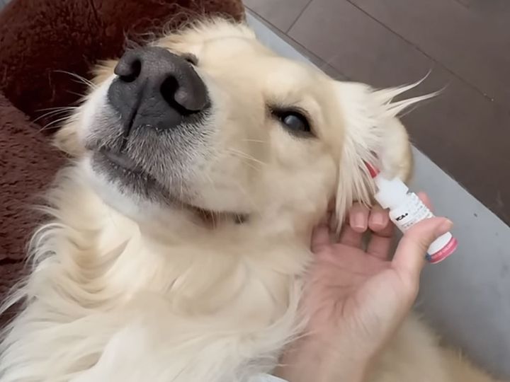 お薬を使う“ふり”をしてメイプルの耳をトントン。