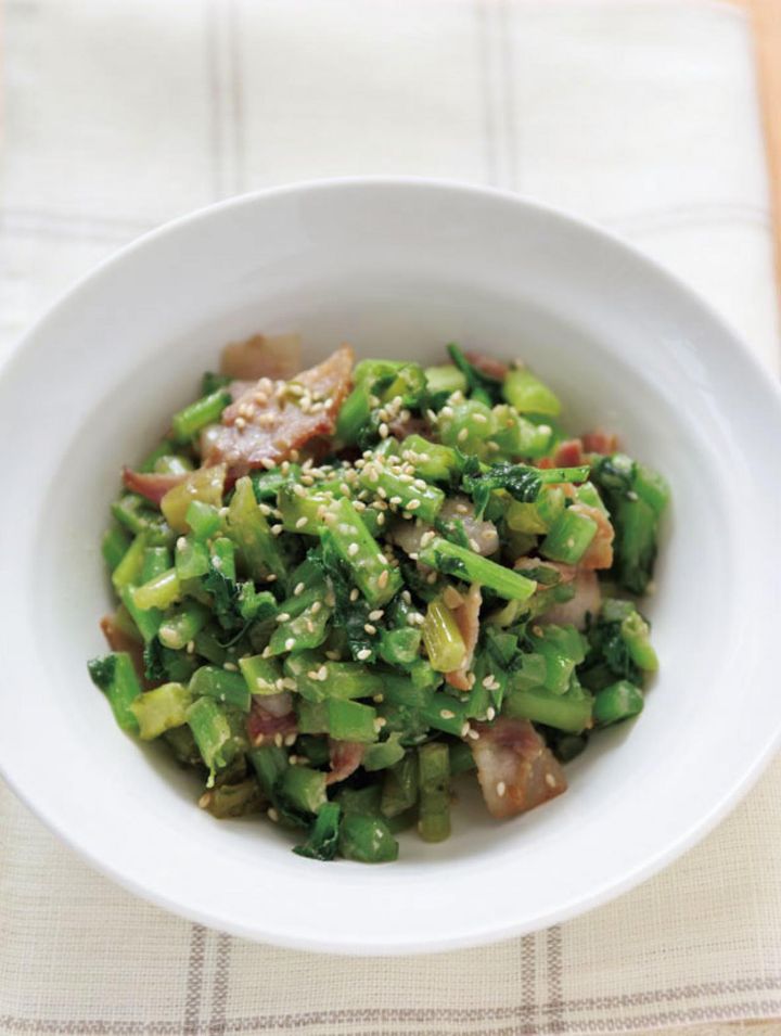 ①大根の葉1本分は刻み、ベーコン2枚は1㎝幅に切る。