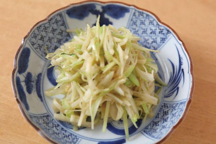 ①大根の皮100gは5㎝長さの細切りに、大根の葉適量は小口切りにする。