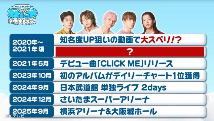 結成1周年を迎えた5人組ボーイズグループWILD BLUEが、エンターテインメント界の著名人をゲストに招き、さらなる飛躍への教訓を学ぶ『WILD BLUEのわぶっていきましょう!』(ABCテレビ)。