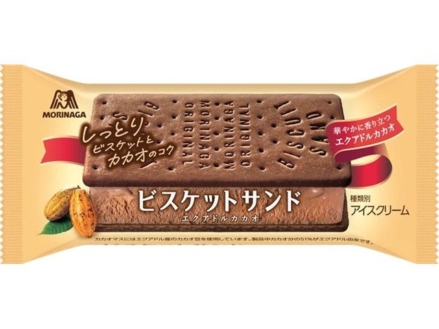 「ビスケットサンド」は1980年の発売以降、40年以上お客様に愛されているロングセラー商品で、これまで多くのお客様にご愛顧いただいております。「ビスケットサンド<エクアドルカカオ>」は、「ビスケットサンド」と同様にアイスクリーム規格にこだわった商品です。アイスクリーム部分には、華やかな香りが特長的なエクアドル産カカオ※を使用しています。また、ビスケット部分にはココアビスケットを採用いたしました。エクアドルカカオ味のアイスクリームの風味にマッチするように、2種類のココアを組み合わせたビスケットを使用し、「ビスケットサンド」の特長であるしっとりとしたビスケットはそのままに、カカオのコクがしっかりと感じられる品質に仕立てました。 立冬を目前に控え、一層肌寒くなるこのタイミングで、しっとりココアビスケットとカカオのコク深いチョコアイスクリームで、心も小腹も満たす、シンプルリッチな上質サンドアイスの発売により、贅沢な時間を演出し、お客様に笑顔をお届けしてまいります。 ※製品中カカオ分の51%がエクアドル由来です。(カカオ原料としてカカオマスとココアパウダーを使用、51%は原料の重量比ではなくカカオ分の比率です)