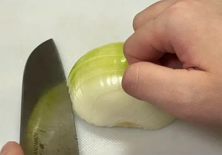 タマネギを半分にカットしてから、まな板と平行になる方向に切り込みを1~2本入れます。