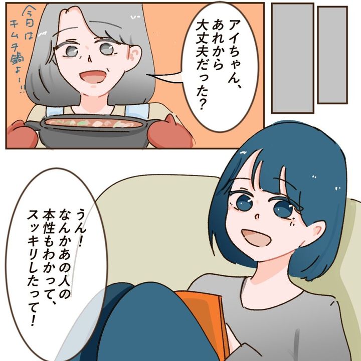 「アイちゃん、あれから大丈夫だった?」そう言うと、「うん!なんかあの人の本性もわかってスッキリしたって!」と笑顔で言うサキ。