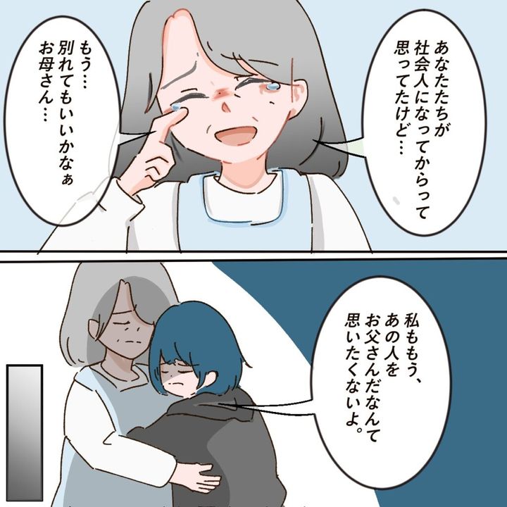 「あなたたちが社会人になってからって思ってたけど・・もう・・分かれてもいいかなぁお母さん・・」と涙を流しながらそう言うと、「私ももう、あの人をお父さんだなんて思いたくないよ」と話すサキと二人、抱き合いました。