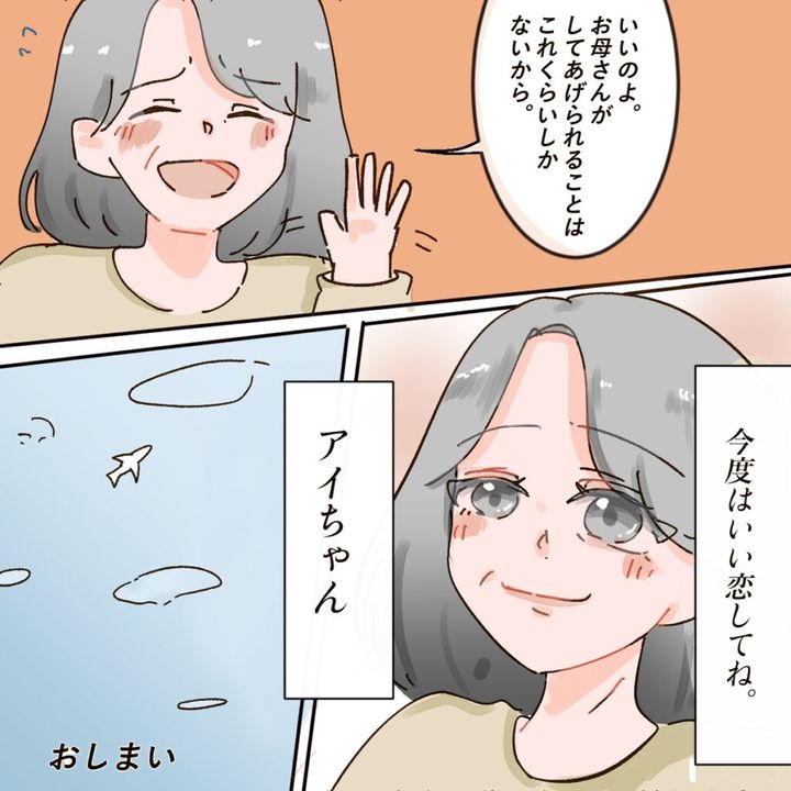 「いいのよ。お母さんがしてあげられることはこれくらいしかないから」留学費用のお礼を伝えられた私は、「今度はいい恋してね。アイちゃん」と空を見上げながら心の中で呟きました。