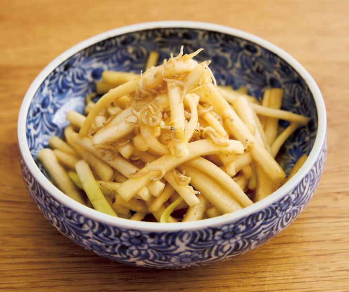 料理家・小林まさるさん直伝の『大根の皮とじゃこの辛子ポン酢漬け』は、厚めにむいた皮にじゃこのうまみをまとわせた、滋味深い一品。