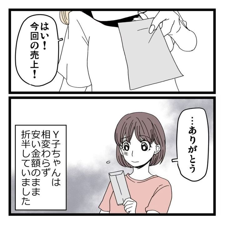 趣味でアクセサリーなどを販売している、はに子さん。フリマ販売に興味を持ったY子さんの提案により、Y子さんのアカウントで子ども服の共同販売を始めることになりました。Y子さんセレクトの服は飛ぶように売れますが、アカウントをチェックしてみると、相談した価格より高値で売られている事実を知ってしまいます。果たして2人の関係性の行く末は?お金がからんだ人間関係を描く、山吹いろ・金銭トラブル漫画(@yamabuki___iro)さんによる作品『ママ友に半年間騙されていた話』をごらんください。