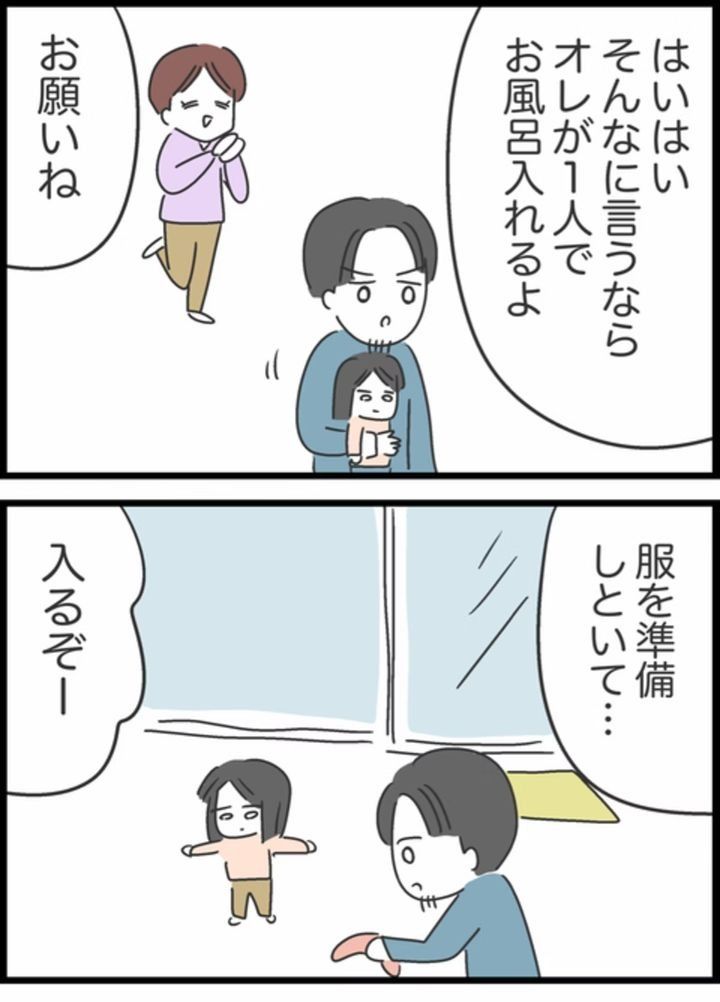 子どもをお風呂に入れ疲れた夫に、飲み物を差し出す妻。「これからはどんどんやってもらうからね」と言うと、夫は「オレ疲れちゃうよ」と驚きの言葉を発して…。