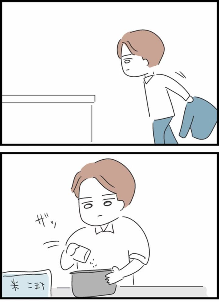 米を研ぎながら、ひたすらようこに謝るしょうた。自分自身が誰にも優しくできていなかったと猛反省しているようです。ようこは、突然のしょうたの変化に戸惑っています。