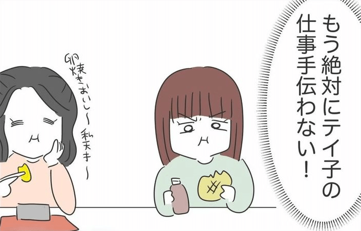 ギブ美に丸投げした仕事を、全部自分の手柄にしようとしたテイ子。しかし、その資料を受け取った宮本くんは、本当は誰が作成したのかを見抜いていました。前日に一生懸命に働くギブ美と会っていたことは、テイ子にとって想定外だったことでしょう。
