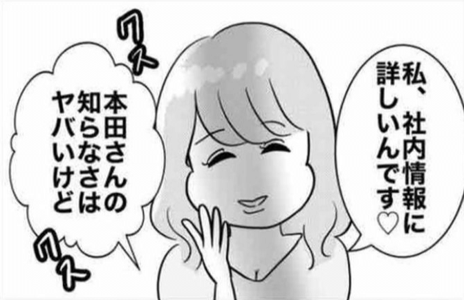 飲み会の席で、本田さんが褒められることが我慢できなかった腹黒さん。すかさず本田さんを落とし、自分を上げる手際は、まさしくお見事としか言いようがありません。