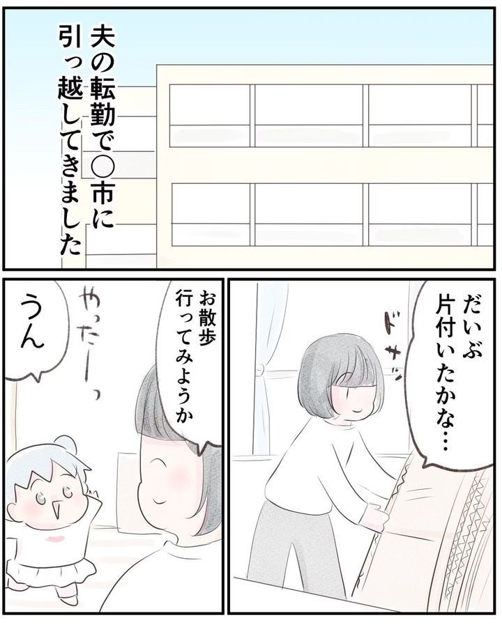 夫の転勤でこのマンションに引っ越してきた小野さんと娘のいちかちゃん。引っ越し作業も一段落したので、小野さんはいちかちゃんと散歩をすることにします。マンション内の公園に気づくと、いちかちゃんと歳の近い子どもとお母さん達を発見。まずは挨拶をしてみたのでした。