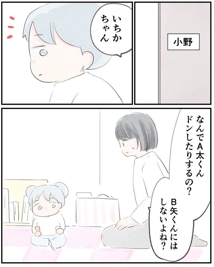 小野さんは、すぐに打ち解けられる知り合いができたことをうれしく思っていましたが、娘のいちかちゃんは、相川さんの息子のA太君と相性が合わずに、すぐにケンカになってしまいます。そしてある日、A太君をつき飛ばして泣かせてしまいました。家に帰ってから、いちかちゃんに事情を聞くといちかちゃんなりにA太君を嫌な理由があるのでした。