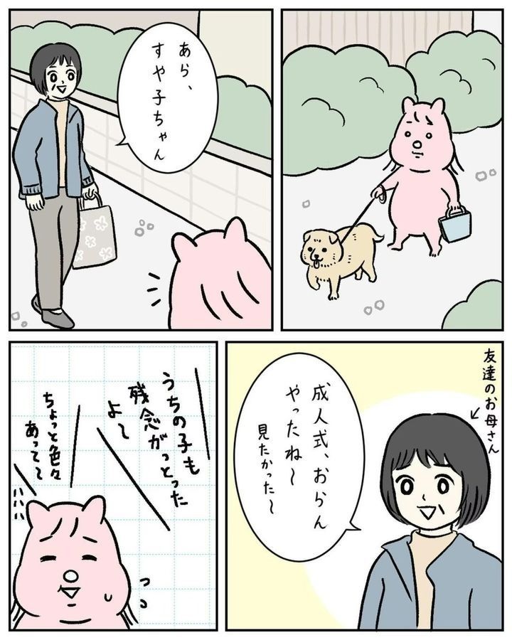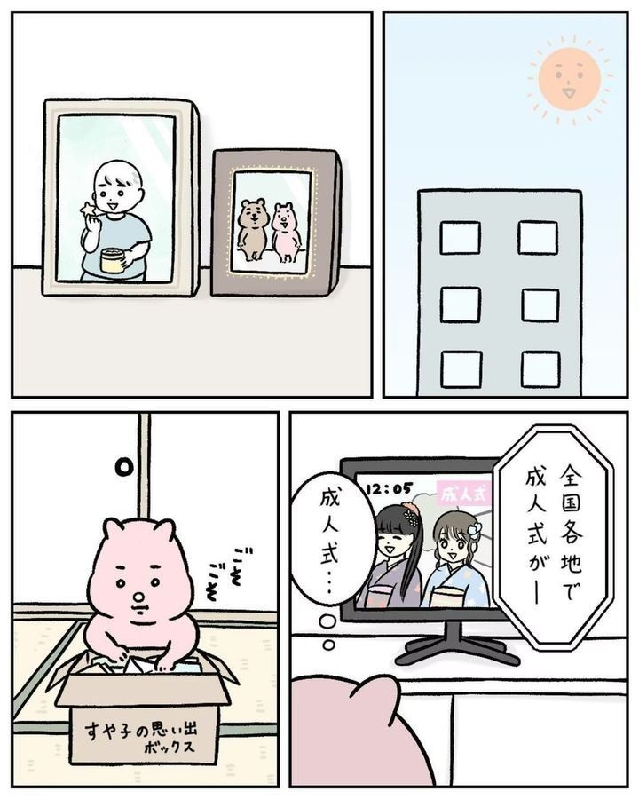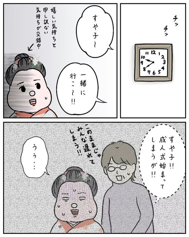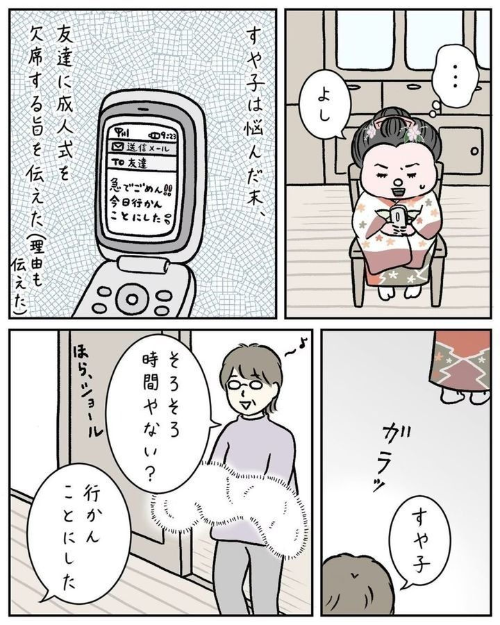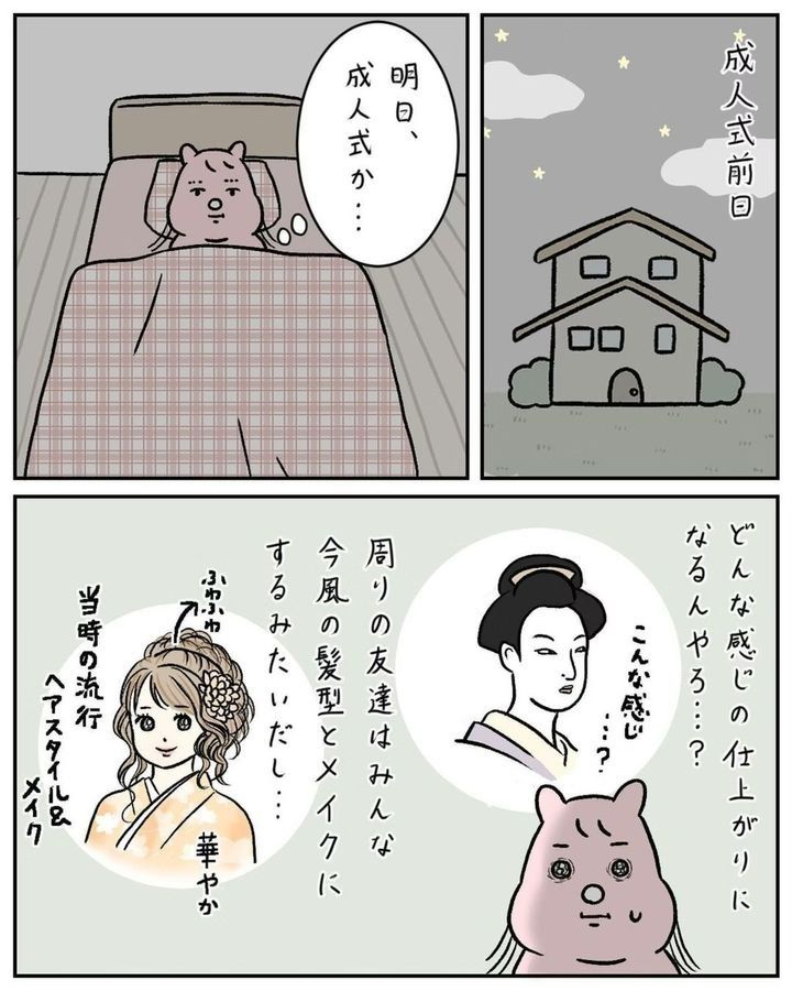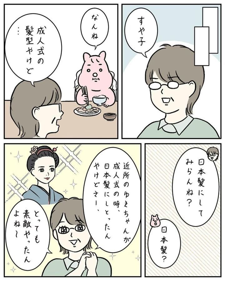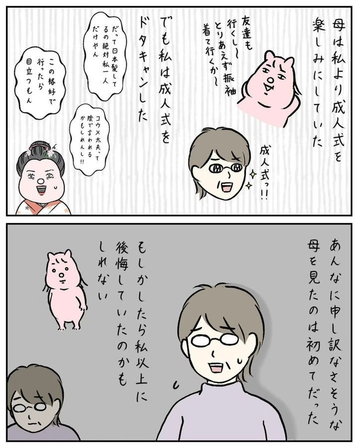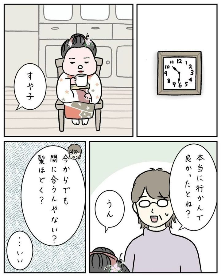 「成人式に思い出の振袖を着てほしい」という母の希望を汲み、髪型も昔ながらの日本髪にセットをしたすやすや子(@suyasuyakoo)さん。しかし、周りの友だちとあまりにも違うことが恥ずかしく…。成人式にまつわるほろ苦い思い出『成人式、後悔してる』をごらんください。