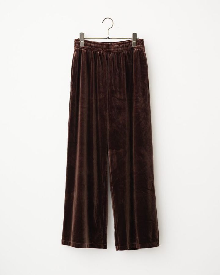 「秋冬になると気になるのがベロア素材。落ち着いた光沢があって、コーディネートに上品なツヤ感を足せる便利な素材です。アイテムはパンツがおすすめ。今季一本目に選ぶならダークブラウン。トレンドカラーでもありますし、ドレッシー過ぎないので、普段着に取り入れやすいです。こちらのパンツは、絶妙な幅のワイドストレート。体のラインを拾いにくいうえ、ストンと落ちて着太りして見えないのも大人にはうれしいポイント。シワになりにくいので、旅行にも重宝しそうです。きれいめスタイルはもちろん、カジュアルスタイルにも合わせやすい万能パンツ。さり気なくおしゃれを格上げしてくれます」