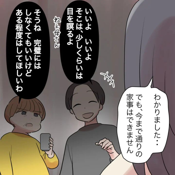 私は静かに「分かりました。でも、今まで通りの家事はできません。」と伝えました。今までは働いていないから「寄生してるだけ」などと散々な言われ方をして、全ての家事を押し付けられていたのです。私が働く気になったことで夫は「いいよいいよ、そこは少しくらいは目を瞑るよ」とどこまでも上から。義母は「完璧にはしなくてもいいけど、ある程度はして欲しいわ」と、自分でやりたくないだけの意見です。