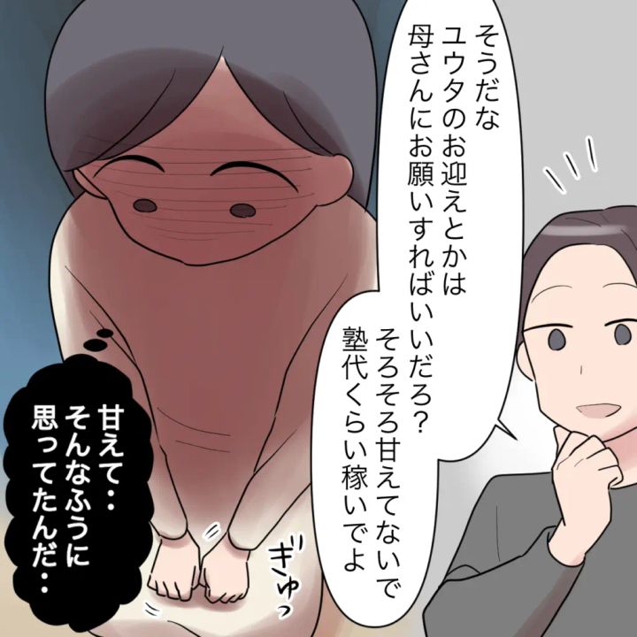 私は妊娠したのを機に結婚して、仕事を辞めざるを得ず、義母に言われるがまま家に入ったのです。それからはずっと文句も言わず家族の世話や雑用をしてきています。まるでタダで使えるお手伝いさんかのように、しかも毎日文句や嫌味に耐えながら。それなのにユウタは義母の提案に「なるほど」という顔で「そろそろ甘えてないで塾代くらい稼いでよ」と言い放ったのです。私は傷つきました。これが夫の言葉?ユウタは私のことをそんなふうに思ってたんだと理解しました。